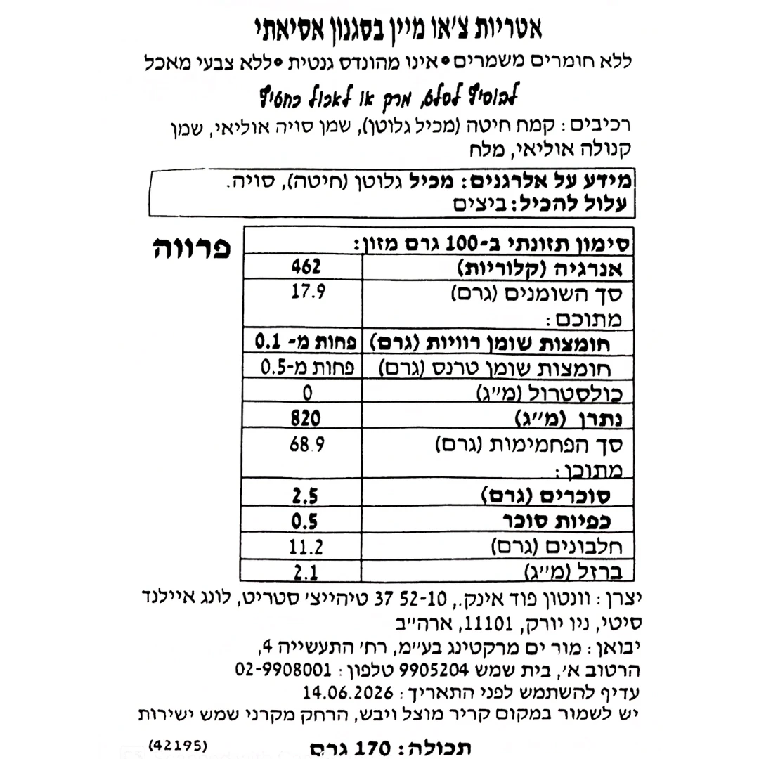 מידע על אלרגנים: מכיל גלוטן (חיטה), סויה. עלול להכיל: ביצים.