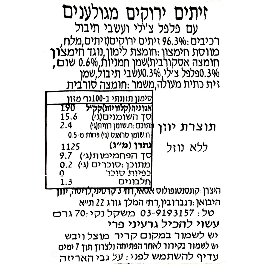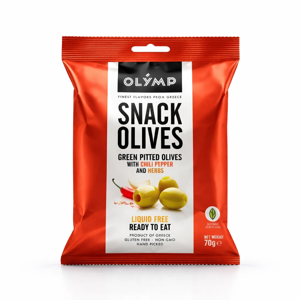 חטיף זיתים ירוקים מובחרים, מגולענים ומוכנים לאכילה, בתיבול עדין של צ’ילי ועשבי תיבול. הזיתים נבחרים בקפידה ביוון, ומגיעים באריזה אישית ללא נוזלים וללא תוספת חומרים משמרים – מתאימים לנשנוש מידי ואישי וגם רעיון מצוין לאירוח!