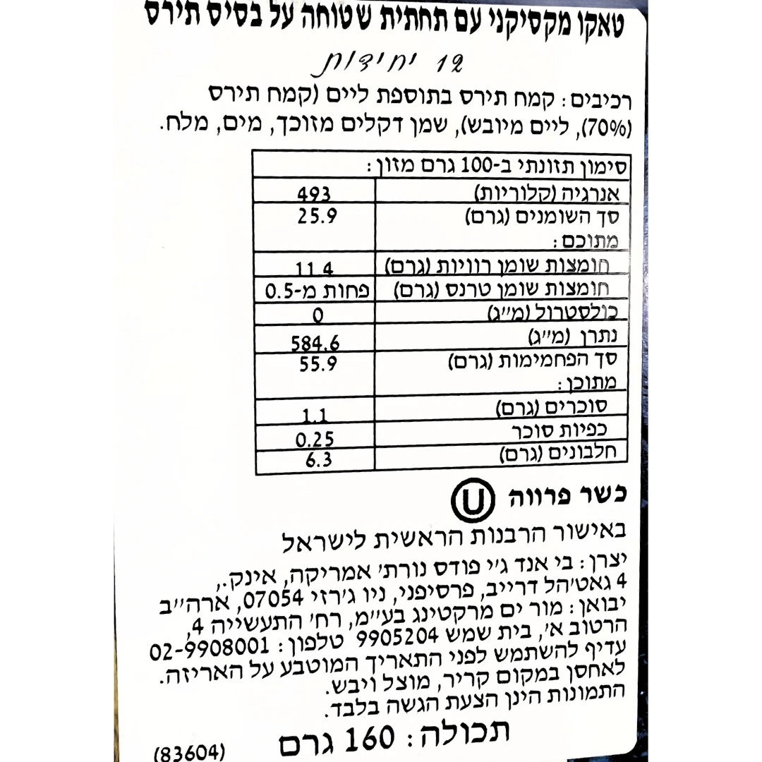 טאקו מקסיקני עם תחתית שטוחה על בסיס תירס צהוב, מעולה למילוי סלט גוואקמולי או בשר מפורק.