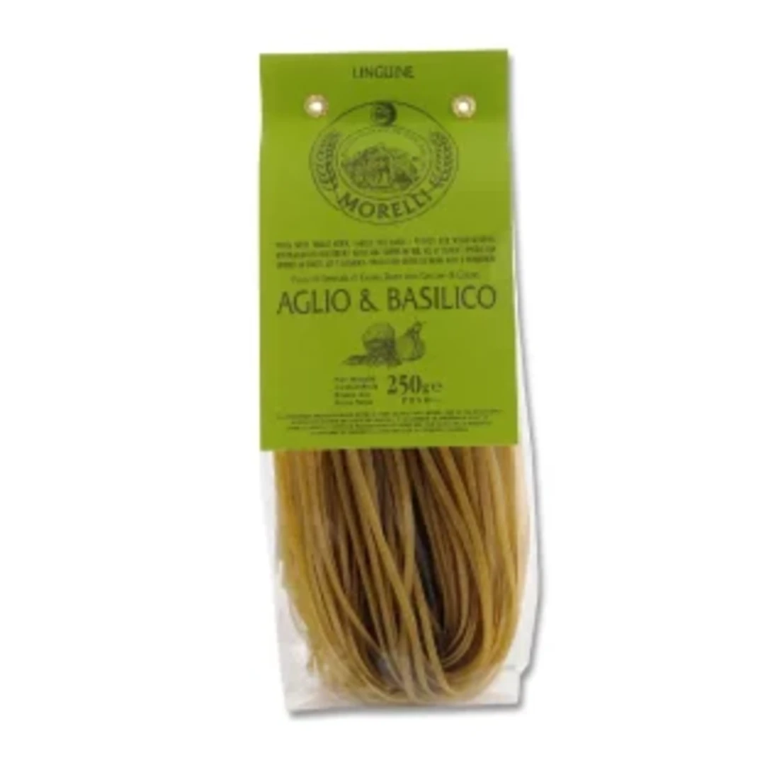 פסטה לינגוויני דקה וצרה, בתוספת שום ובזיליקום.