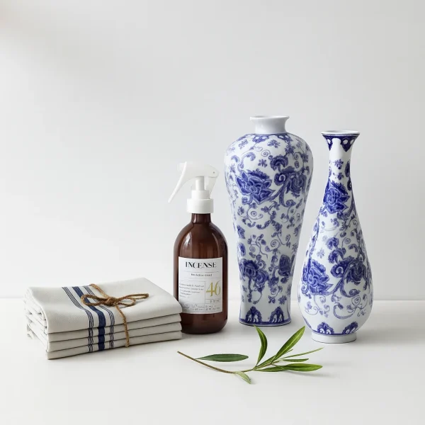ואזה מקרמיקה בעיטורי פרחים כחולים בעיצוב אלגנטי. אידיאלי לסידורי פרחים קטנים, לעיצוב שולחן חגיגי או להוספת נגיעה עיצובית לבית.