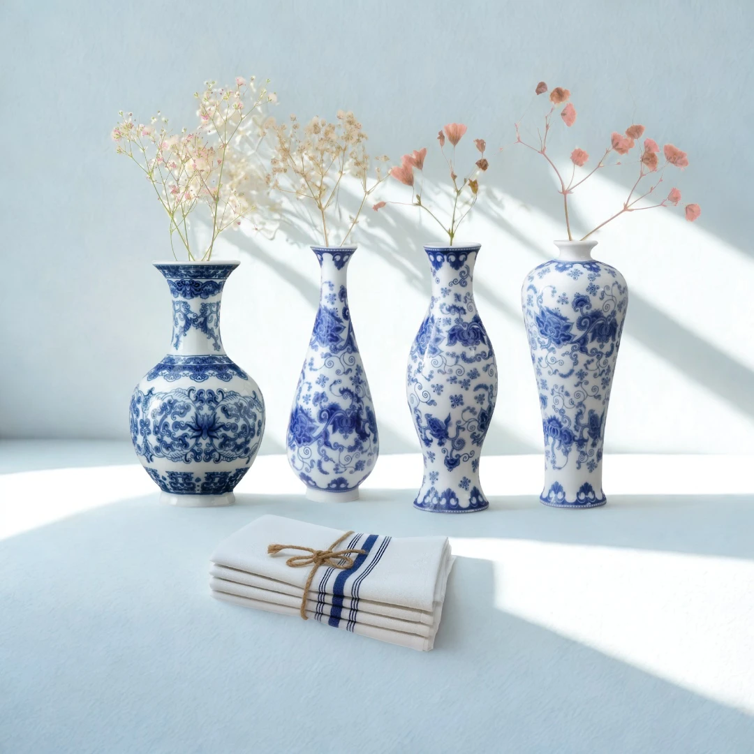 מארז עיצוב לבית ולאירוח ברוח ים-תיכונית, הכולל ארבע ואזות קרמיקה בגווני כחול־לבן ומפיות בד תואמות.