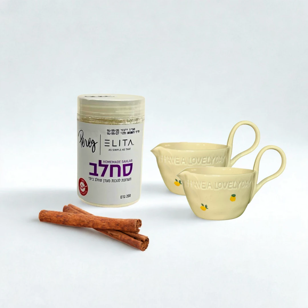 מארז החורף של אליטה. תערובת להכנת סחלב חם של אליטה ופרג יחד עם זוג ספלים בעיצובה של אליטה מסדרת LOVELY DAY.