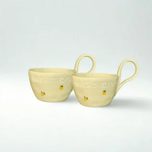 זוג ספלים מסדרת LOVELY DAY. ספלים מקרמיקה בעיצוב אישי של אליטה בעיטור לימונים בצבע טבעי לשתייה חמה ומפנקת.