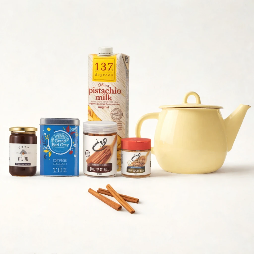 מארז חורפי ומפנק הכולל קומקום לחליטה, תה שחור איכותי, דבש, משקה שקדים ותבליני קינמון ואגוז מוסקט לצ'אי המושלם. שילוב חמים, מתובל ומלא רוגע – מושלם לימים הקרים או כמתנה מחממת לחורף.