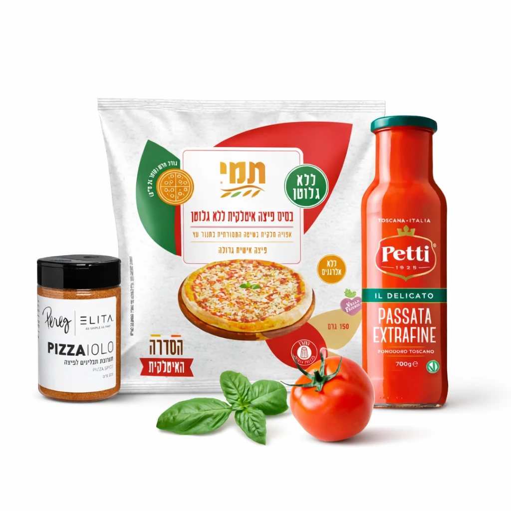 מארז פיצה מפנק ליחיד! הערכה המושלמת לערב פיצה חלומי. מכיל בסיס פיצה אישי אפוי חלקית ללא גלוטן שלא דורש ממכם כלום חוץ מלפזר תוספות, רוטב עגבניות איטלקי אמיתי ותבלין הפיצה המפורסם שלי שאי אפשר לאכול פיצה בלעדיו.