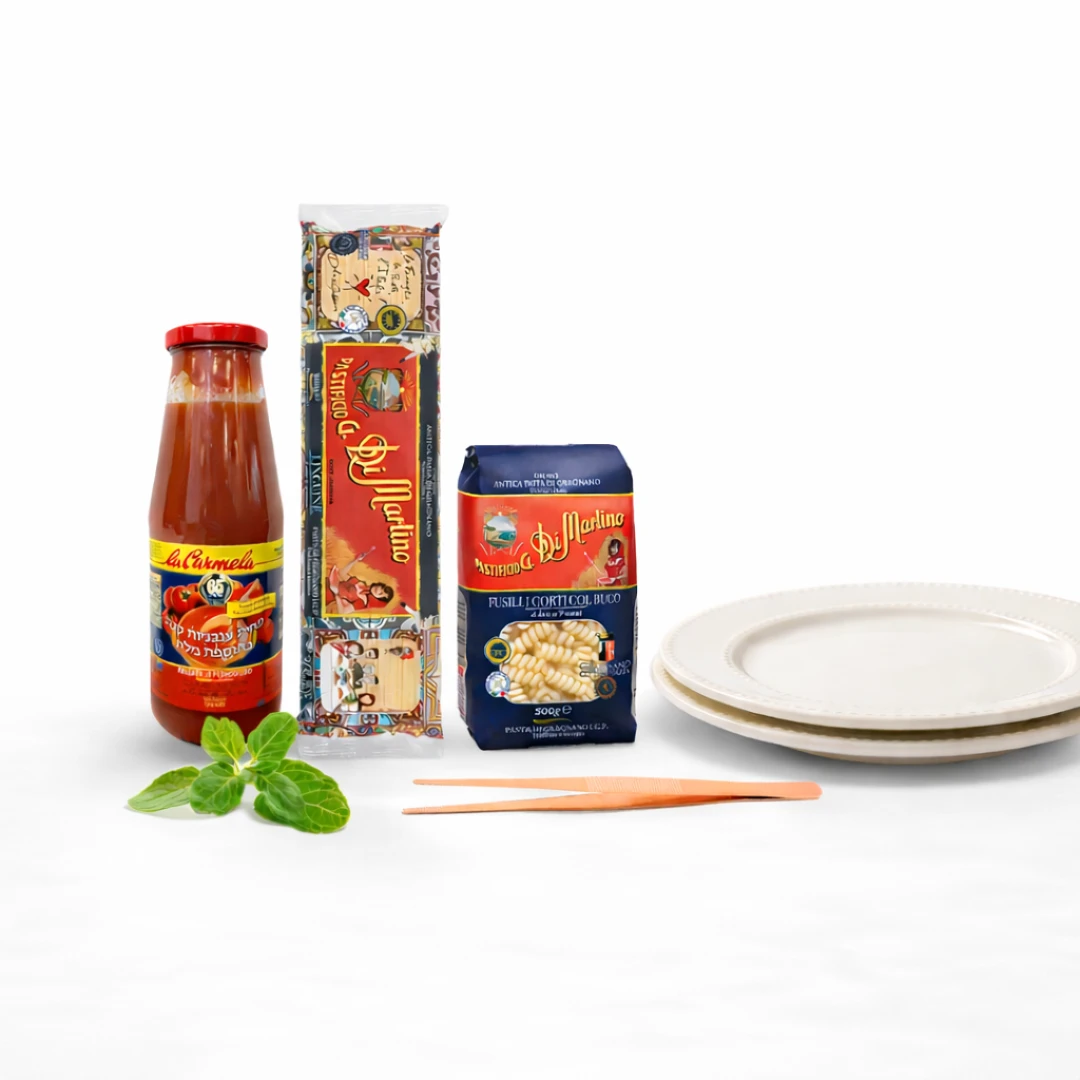 מארז בניחוח איטלקי לאירוח זוגי. זוג צלחות בעיצוב קלאסי אלגנטי, מצרכים לפסטה איטלקית אמיתית ופינצטה של אליטה שתהפוך את ההגשה לרמה הכי גבוהה שתכירו.