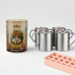 מארז קקאו פרימיום של Van Houten בפחית אספנות קלאסית גדולה, שתי כוסות נירוסטה כסופות שישמרו על המשקה קר ומרענן ותבנית קרח ורודה להשלמת החוויה.