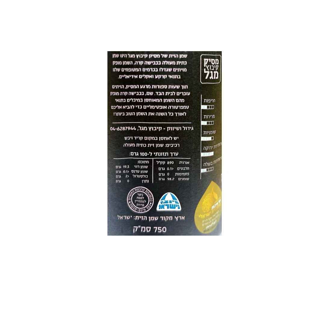 מסיק קיבוץ מגל נולד מתוך חיבור עמוק לאדמה ולעצי הזית, מאז הקמת הקיבוץ ב־1953 בלב עמק חפר. בעקבות משבר המים בסוף שנות ה־90 עבר הקיבוץ להתמקד במטעי זית, שיקם חלקות בעל ונטע כרמים חדשים, וכיום הוא מגדל מעל 700 דונם של זיתים בפיקוח מקצועי קפדני. כל שמני מסיק מיוצרים בכבישה קרה, מזיתים שגדלו במטעי הקיבוץ ובמספר מטעים מפוקחים בלבד, בדרגת כתית מעולה ובחומציות של עד 0.5%. לצד הזית, הורחבה הפעילות גם לגידול שומשום ישראלי איכותי, המשמש להפקת טחינה, שמן וגרעינים כולם משלבים מסורת, מומחיות חקלאית ואהבה אמיתית למקום.