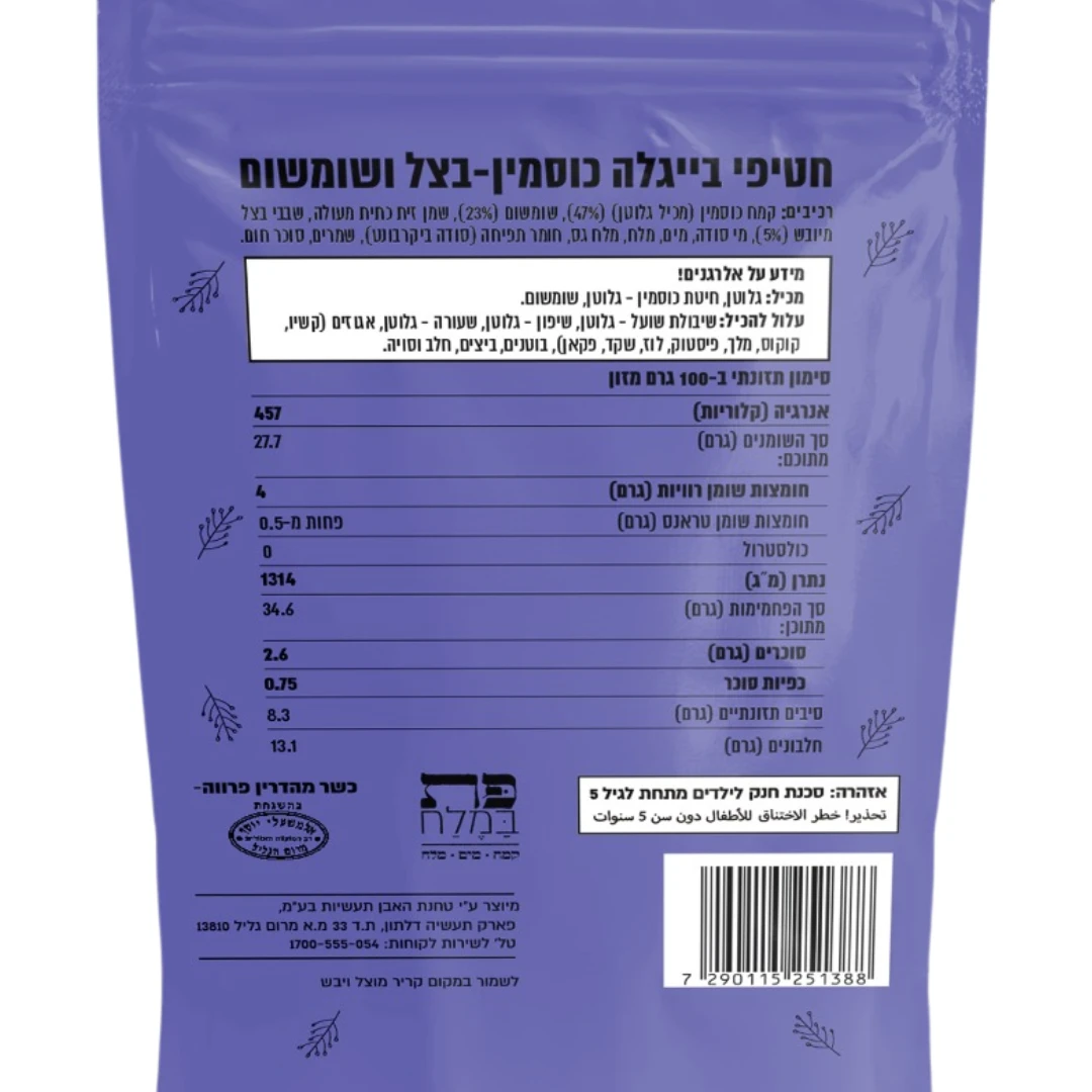 מידע על אלרגנים: מכיל: חיטת כוסמין – גלוטן, שומשום. עלול להכיל: ביצים, שעורה – גלוטן, שיבולת שועל – גלוטן, שיפון – גלוטן, סויה, בוטנים, אגוזים (קשיו, מלך, לוז, שקד, פיסטוק, פקאן, קוקוס) וחלב.