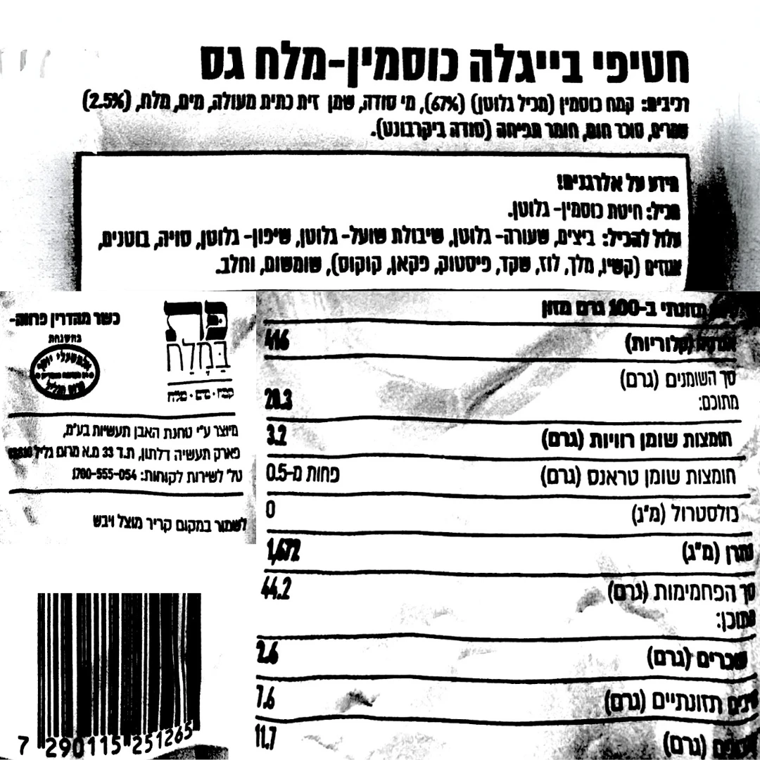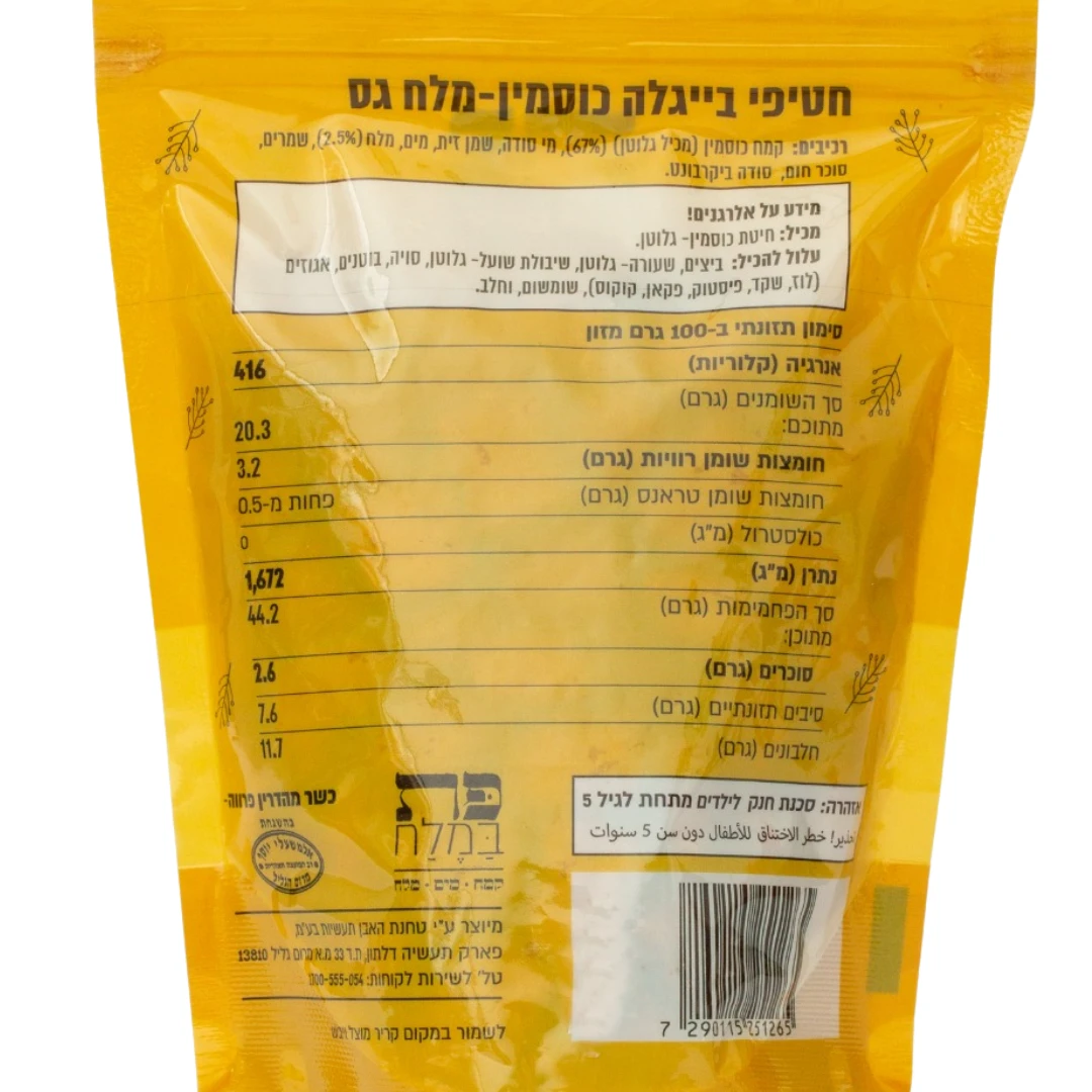 מידע על אלרגנים: מכיל: חיטת כוסמין – גלוטן. עלול להכיל: ביצים, שעורה – גלוטן, שיבולת שועל – גלוטן, שיפון – גלוטן, סויה, בוטנים, אגוזים (קשיו, מלך, לוז, שקד, פיסטוק, פקאן, קוקוס), שומשום וחלב.