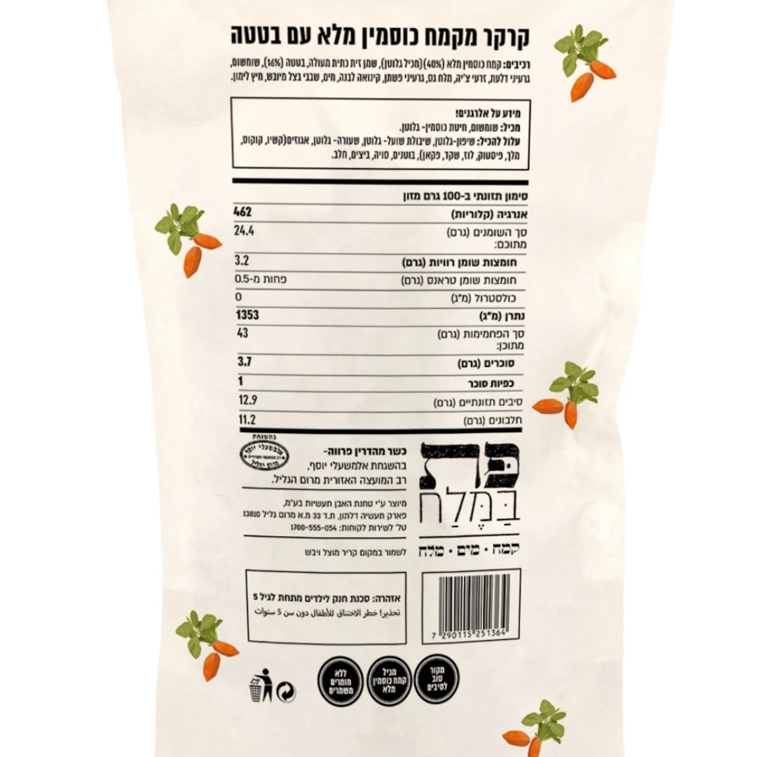קרקרים מקמח כוסמין מלא ובטטה של "פת במלח". קרקרים עם מרכיבים בריאים שיסגרו לכם פינה עם נשנוש טעים ומזין. מקור טוב לסיבים, מכיל קמח כוסמין מלא וללא צבעי מאכל.