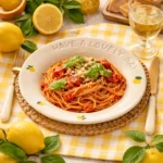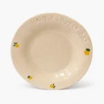 צלחת מנה עיקרית עמוקה לפסטה עשויה קרמיקה במראה עבודת יד ממש כמו באיטליה, בגוון חול טבעי עם עיטורי לימונים.