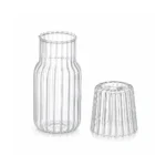 קנקן זכוכית עם מכסה תואם בטקסטורת פסים אלגנטית, ניתן להשתמש במכסה ככוס לשתייה אישית.