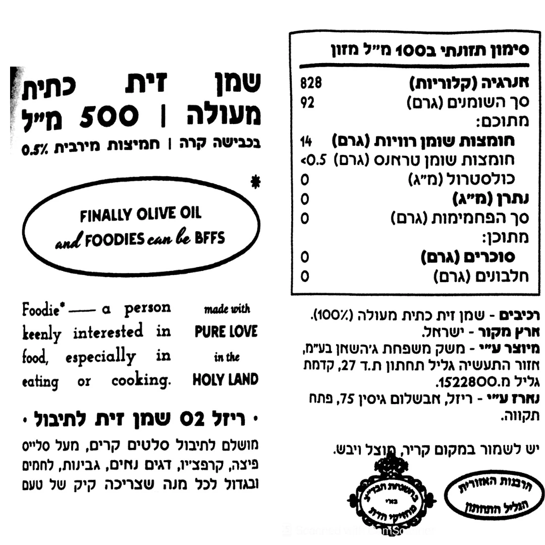 ריזל 02 – שמן זית כתית מעולה מזן סורי, בכבישה קרה ובחמיצות מירבית של 0.5%, שמן שהוא 100% ישראלי. טעם חרפרף, עמוק ודומיננטי שמעניק קיק מושלם לסלטים, דגים נאים, בשר וגבינות, בבקבוק לחיץ עם פיה לשליטה מדויקת בכמות.