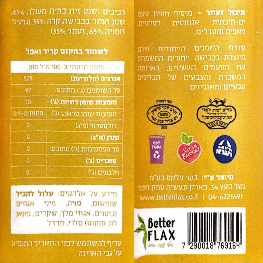 Better Flax היא חברה מובילה בתחום המוצרים הטבעיים, עם התמחות בשמנים בכבישה קרה תוך שמירה על הערכים התזונתיים וטעמים מיוחדים. כל מוצר מיוצר מחומרי גלם איכותיים במיוחד, ומתאים לאורח חיים בריא ומודע.