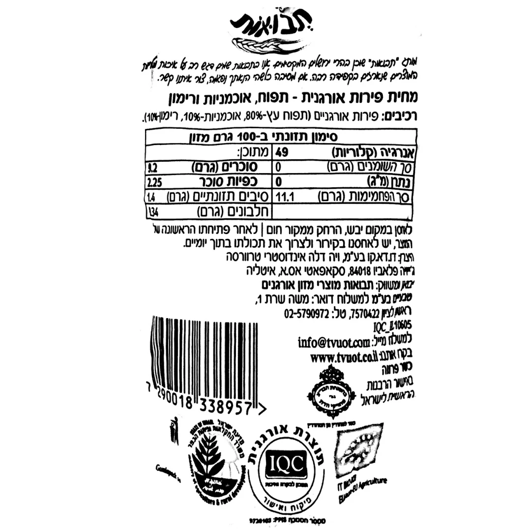 רכיבים: תפוח עץ אורגני (פרי – 80%), אוכמניות (10%), רימון (10%).
