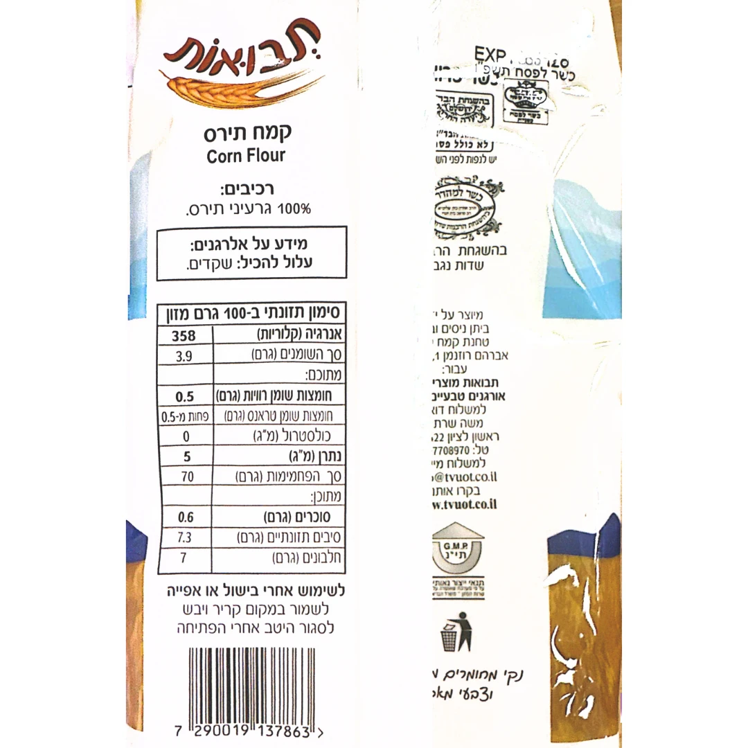 קמח תירס של תבואות מופק מגרעיני תירס טחונים (רכיבים טבעיים בלבד). קמח טבעי וללא גלוטן המתאים למגוון שימושים במטבח – החל מהכנת לחמים, מאפים ופולנטה ועד לציפוי פריך לטיגון, הכנת לביבות, פנקייקים ומאפים ביתיים.