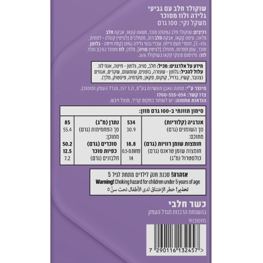 מידע על אלרגנים: מכיל: חלב, סויה, גלוטן – חיטה, אגוז לוז. עלול להכיל: גלוטן – שעורה, בוטנים, שומשום, שקדים, אגוזים (צנובר, קשיו, ברזיל, קוקוס, פקאן, מקדמיה, פיסטוק, מלך).