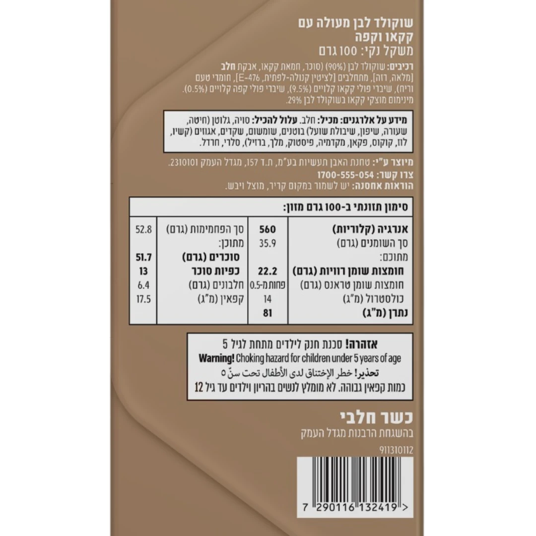 מידע על אלרגנים: מכיל: חלב. עלול להכיל: סויה, גלוטן – חיטה (שיפון, שיבולת שועל ושעורה), בוטנים, שומשום, שקדים, אגוזים (קשיו, לוז, קוקוס, פקאן, מקדמיה, פיסטוק, ברזיל, מלך), סלרי, חרדל.