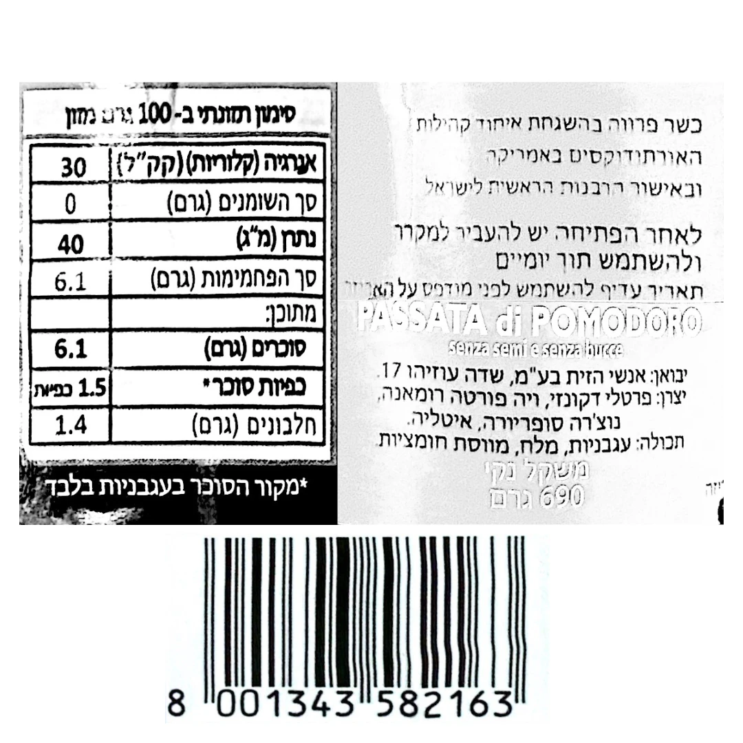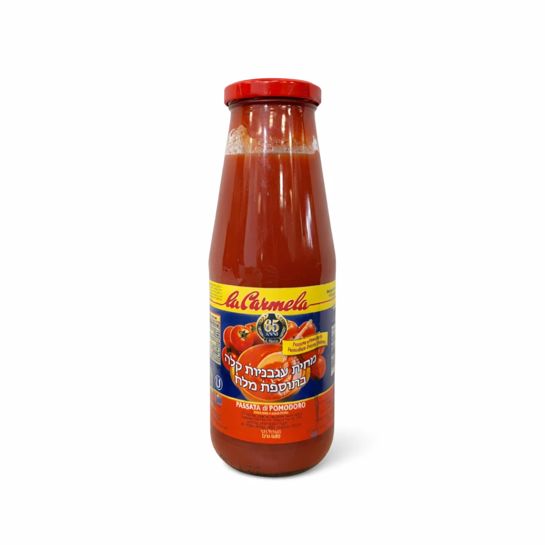 PASSATA DI POMODORO של La Caramela – רוטב עגבניות איטלקי חלק ועדין בתוספת מלח, עשוי מעגבניות בשלות היישר מאיטליה. המרקם הקטיפתי והטעם הטבעי והמאוזן הופכים אותה לבסיס מושלם לפסטות, פיצות, רטבים, תבשילים ומנות איטלקיות קלאסיות. ללא תוספים מיותרים, רק עגבניות איכותיות (מקור הסוכר בעגבניות בלבד).