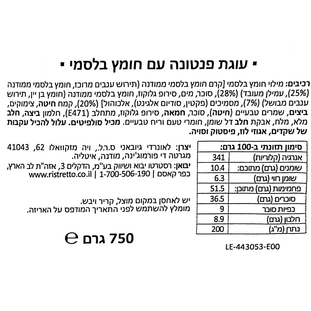 עוגת פנטונה היא קינוח איטלקי מסורתי שמקורו במילאנו, הידוע במרקם האוורירי שלו, בחמאה עשירה ובהתפחה ארוכה שמעניקה לו רכות מיוחדת. הבצק העשיר משלב בתוכו פירות מיובשים ארומטיים שמוסיפים מתיקות טבעית ומרקם מרענן. עוגת הפנטונה של Leonardi מגיעה עם טוויסט ייחודי. מילוי גלייז חומץ בלסמי איכותי שמעניק לעוגה עומק טעמים לא רגיל, איזון עדין של מתיקות וחמיצות, ויוקרתיות מפתיעה.
