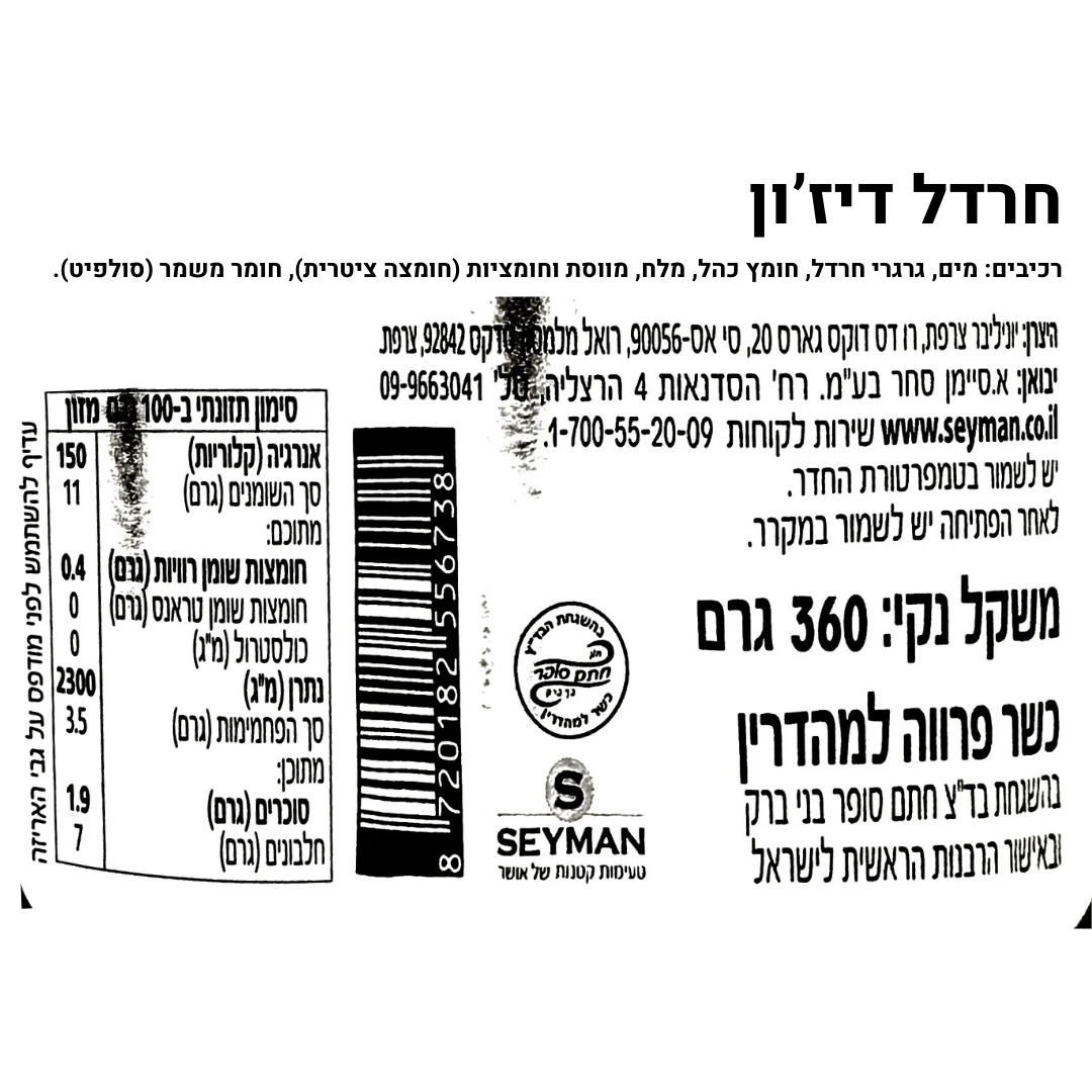 כשרות: בהשגחת הבד"ץ חתם סופר בני ברק ובאישור הרבנות הראשית לישראל