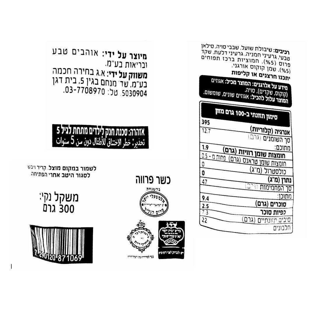 מידע על אלרגנים: המוצר מכיל: אגוזים (קוקוס, שקדים), סויה. המוצר עלול להכיל: אגוזים שונים, שומשום.