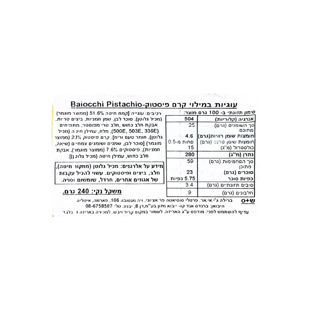 אלרגנים: מכיל: גלוטן (ממקור חיטה), חלב, ביצים ופיסטוקים. עשוי להכיל עקבות של אגוזים אחרים, חרדל, שומשום וסויה.