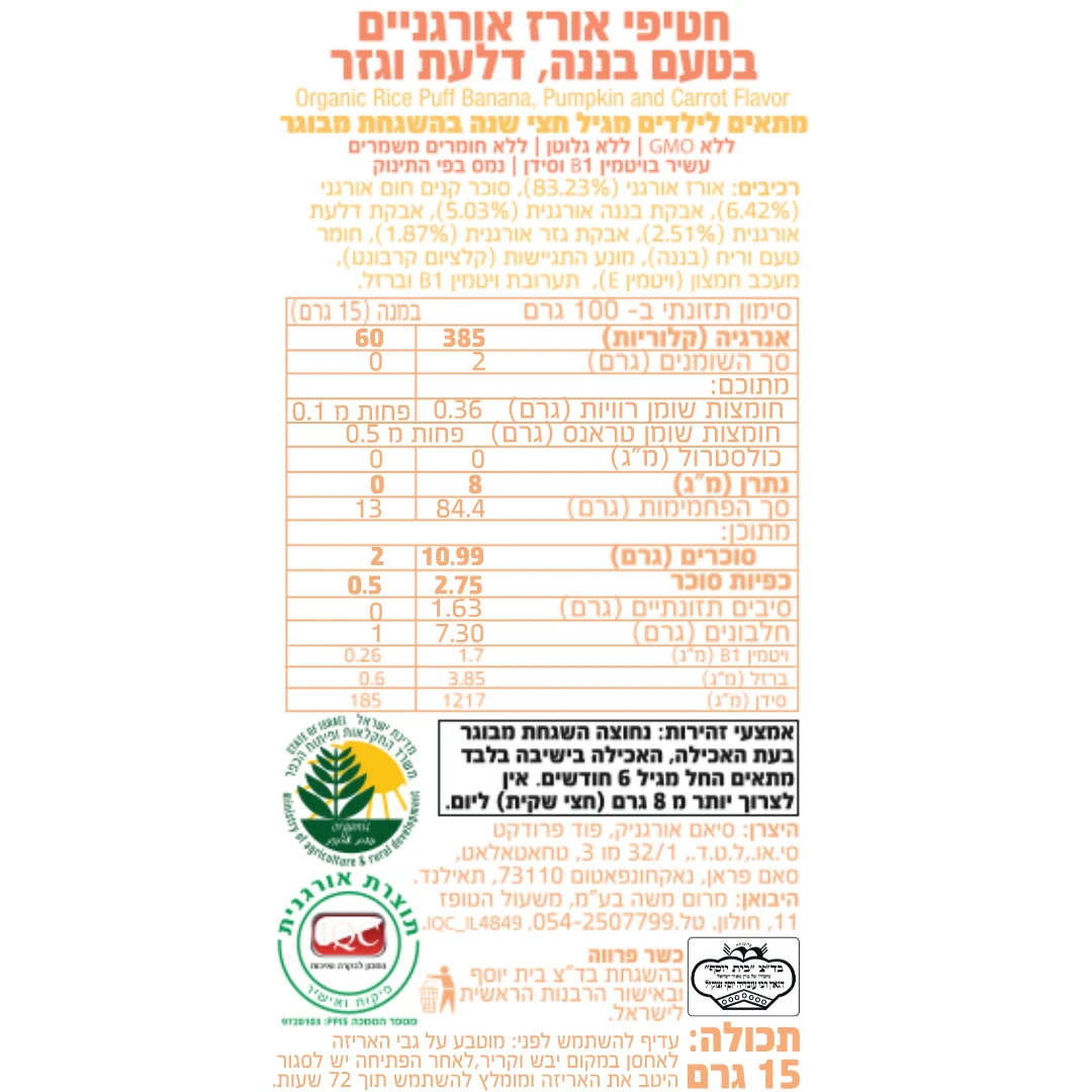 חטפי אורז אורגניים בטעם בננה, דלעת וגזר. עשויים ממרכיבים אורגניים מובחרים, מלאים ברכיבים תזונתיים מוויטמינים ומינרלים שתומכים בבריאות ובהתפתחות. לחטיף מרקם שנמס בקלות בפה ועם צורה שמלהיבה את הדמיון.