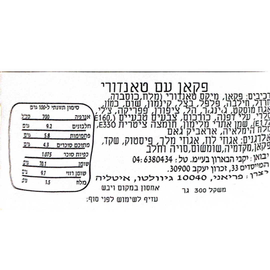 פקאן קלוי בתיבול טנדורי. שילוב ייחודי של אגוז פקאן פריך עם תערובת תבלינים הודית עשירה ומעט מעושנת, איזון של מתיקות האגוז לטעמים הארומטיים של כמון, כוסברה ופפריקה. מושלם לנשנוש או להוספה לסלטים ולגבינות רכות.