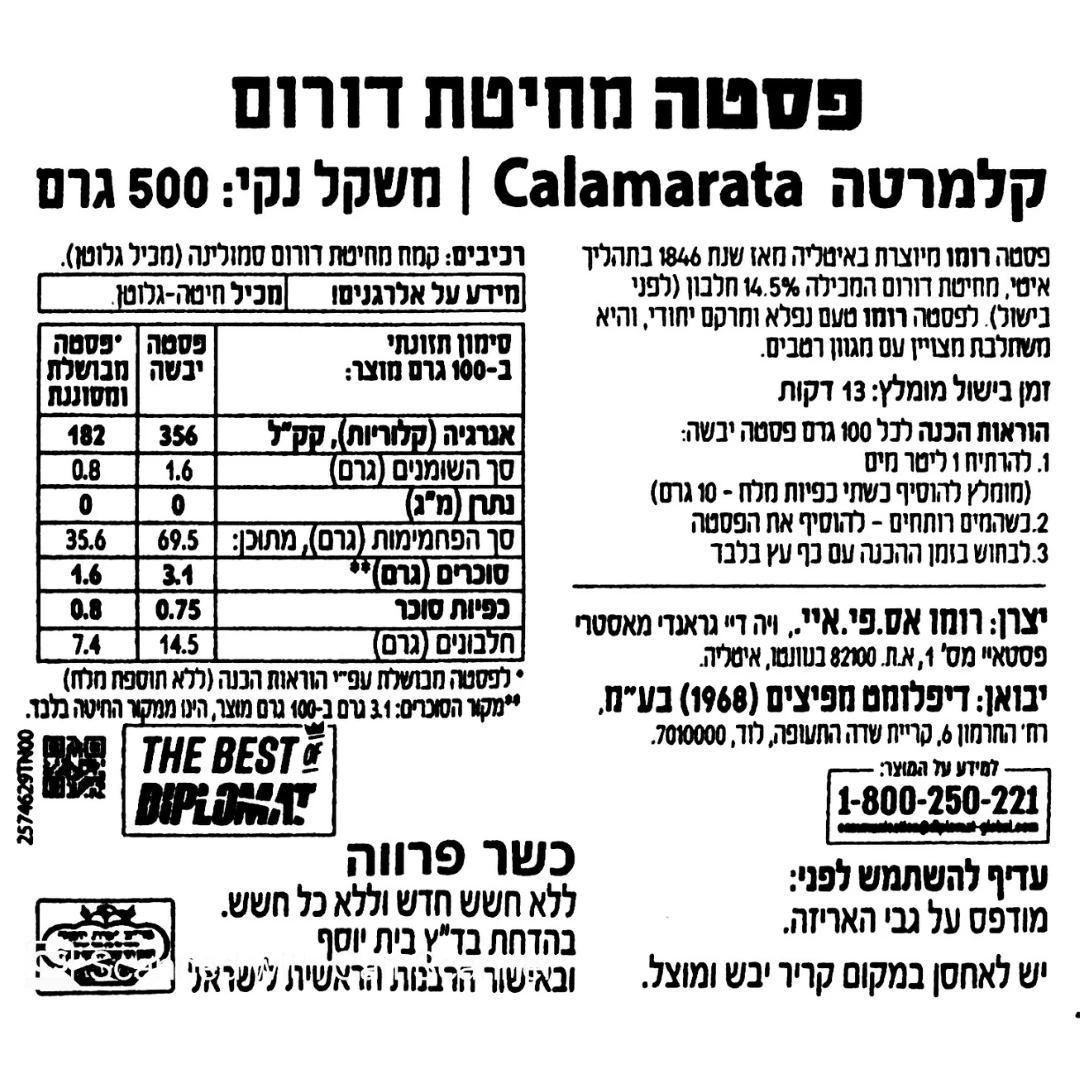 קלמרטה (Calamarata) של RUMMO היא פסטה איטלקית בצורה טבעות רחבות שתופסות את הרוטב בצורה מושלמת. מיוצרת מחיטת דורום איכותית ובייבוש איטי לשמירה על מרקם מושלם ועמידות בבישול.
