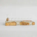 חנוכיה קלאסית מנתח עץ זית גולמי עם מילוי אפוקסי לבן איכותי. החנוכיה משמרת את יופיו וצורתו של עץ הזית ומולידה חיבור בין חומרים טבעיים לחומרים מודרנים שמולידים יצירה ייחודית עם נוכחות עוצמתית. מגיעה יחד עם כוסיות זכוכית (מגיעה ללא שמן).