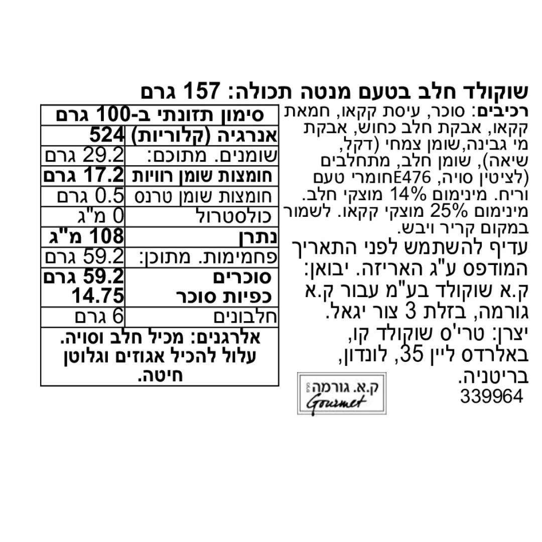 שוקולד חלב בטעם מנטה מבית Terry’s הוא שילוב קלאסי של שוקולד חלב עם נגיעת מנטה מרעננת. הטעם אינו דומיננטי מדי, אלא משתלב בעדינות ומעניק סיומת מיוחדת בפה. המוצר מגיע בצורת פלחים כדי ליהנות מהשיתוף או מנשנוש לאורך זמן. הוא מתאים במיוחד לחובבי השילוב הקלאסי של שוקולד ומנטה, ומיוצר עם ארומת מנטה טבעית.