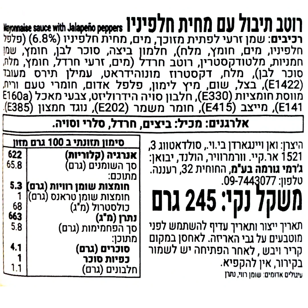 אלרגנים: מכיל: ביצים, סויה, סלרי, חרדל.