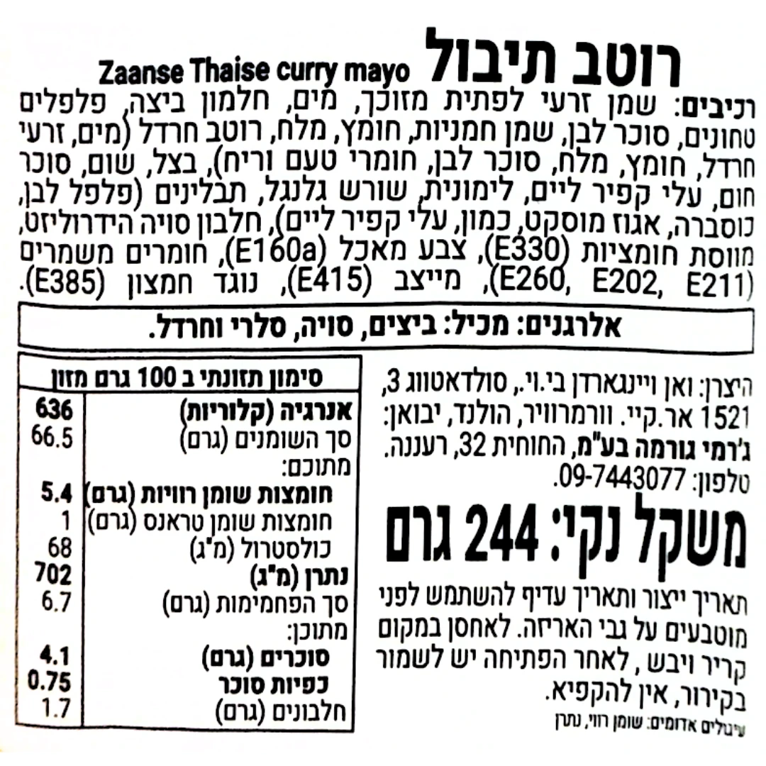 אלרגנים: מכיל: ביצים, סויה, סלרי, חרדל.